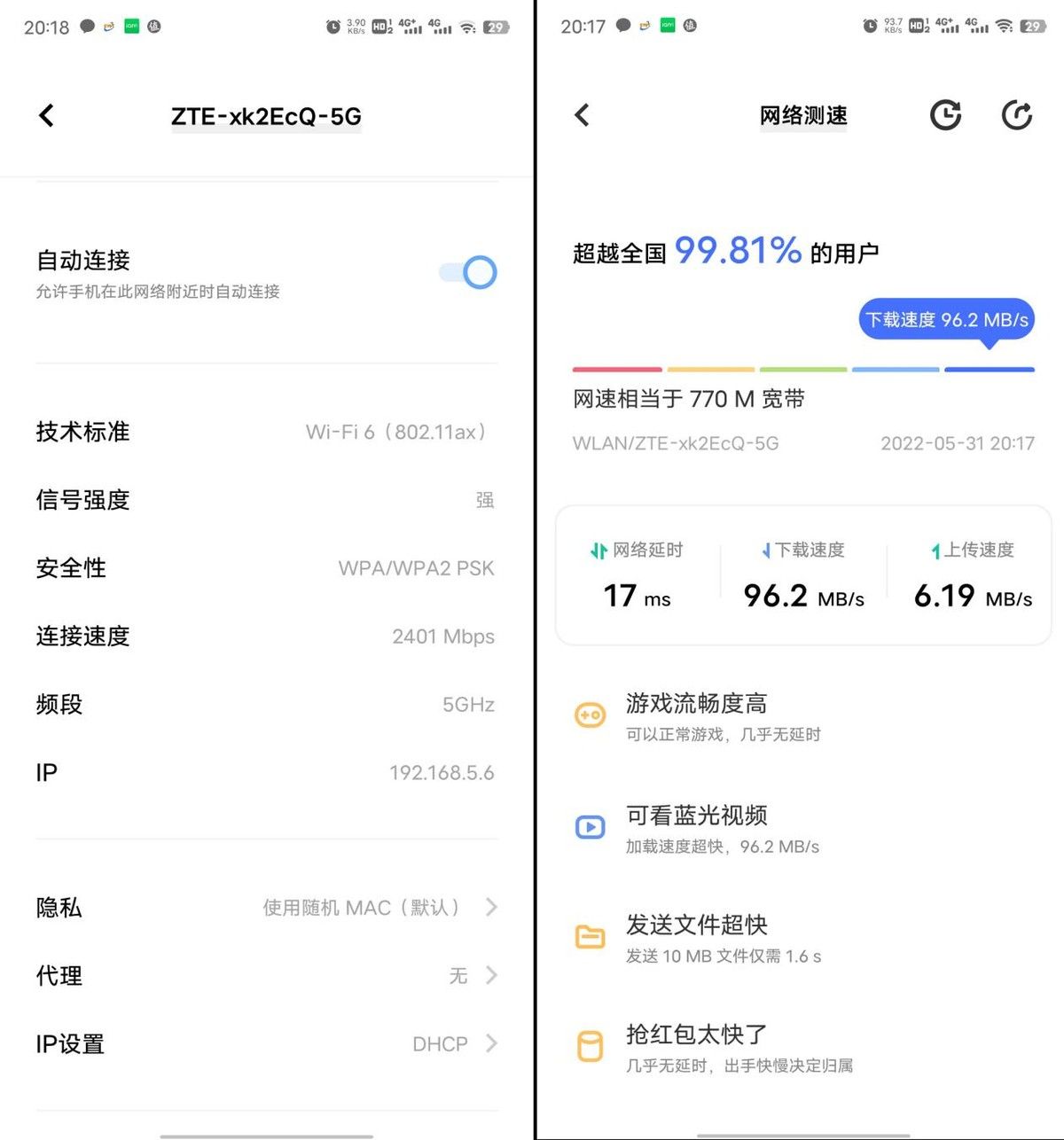 然后测试了离路由器最远的一个卧室,测试点的直线距离大概11米,中间隔着一堵墙,这个卧室一直信号不是很好,平时5G频段都会自动选择更换为2.4G,而此次的中兴AX3000巡天版使用中,可以看出选择5G频段一直很稳定,连接速率可以达到2401Mbps,测速结果上传速度6.19MB/S,下载96.2MB/S,基本达到了移动的千兆水平。
