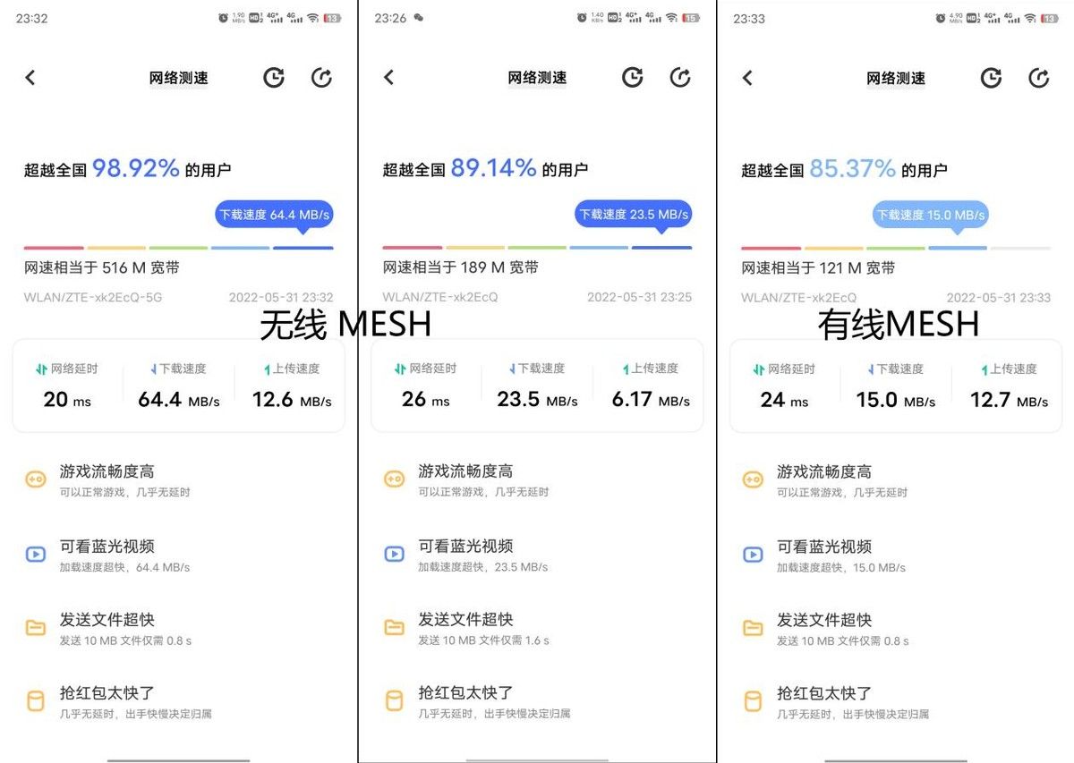 而有线组网更简单,只需将副路由的WAN口通过网线连接到主路由的LAN接口即可,此时状态灯双闪之后变成常绿就表示连接成功了。测试了以下有线与无线的速度,无线速度的5G,2.4G表现正常,而我家有线则只有100M的带宽速度,主要是我家房间这个预埋的网线已经很久了,达不到千兆的要求,最大只能百兆;所以建议如果你家预埋的网线无法达到千兆要求,那么用无线MESH组网还是更合适些!