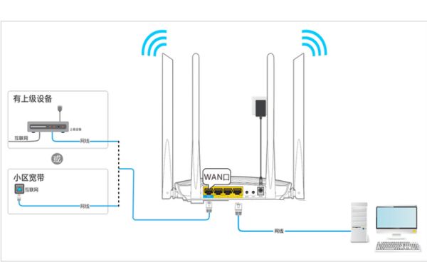 如下图所示WAN口连接宽带进线(即网络公司进来的线或猫出来的线,一般颜色不一样)、LAN口连接局域网内的电脑。