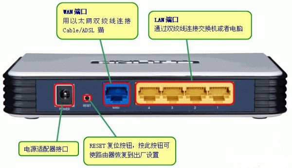 1、将副路由器的所有其他设备解除连接,将路由器的LAN口(一般为四个颜色一样的口)与电脑相连,路由器示例图如下;