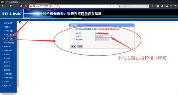 4、修改LAN口参数。比如你的主路由器是192.168.1.1,那么第二个路由就是192.168.2.1.