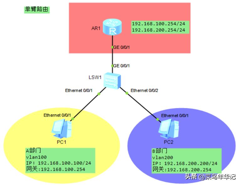 任务需求:公司由于业务系统需要,要求通过华为路由器,来实现A部门和B部门之间进行互访。拓扑如下图所示