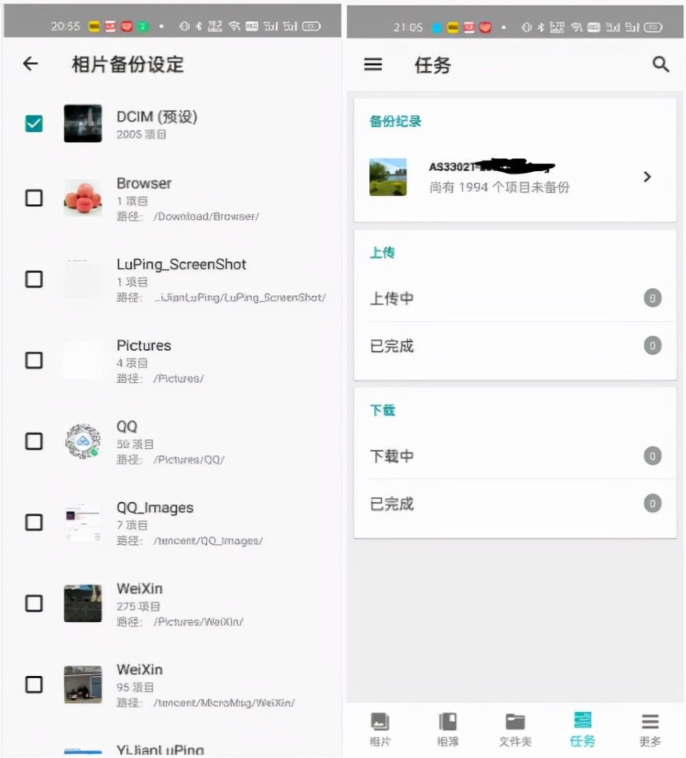 登入成功后,点击下方的“任务”点击顶上的备份,此时可以备份手机内的所有照片还是新增照片,如果说手机内的照片之前没有备份过,选择备份全部照片。如果之前已经有备份,那么选择备份新增照片即可。手机中的哪些文件夹需要备份,哪些不需要备份也都可以进行设置。