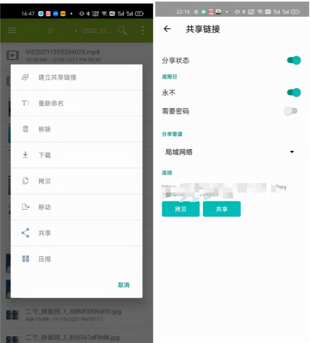 如果想把NAS中图片分享给别人,或者自己在其他网络下的电脑读取一部分图片,可以选中后点击建立共享链接,可以选择分享到局域网还是互联网。选择分享到互联网后则可以生成一个固定的外网链接,可以随时随地在有网络的地方读取。