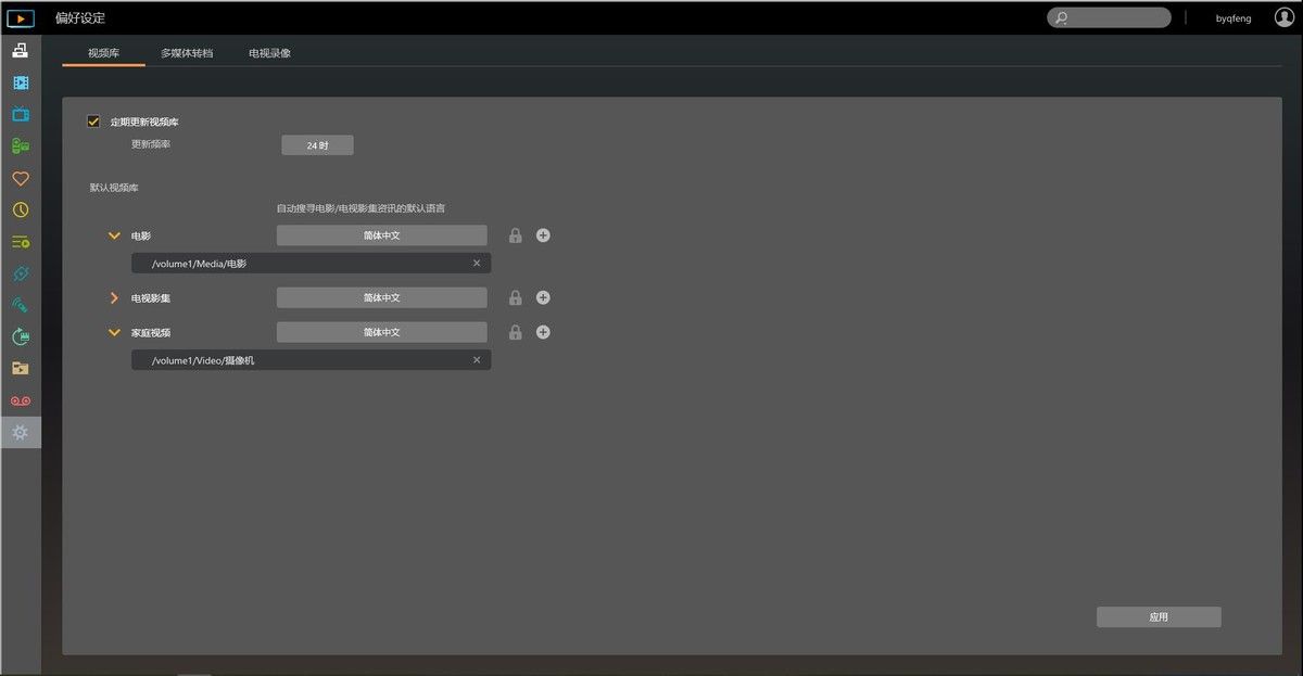 首先进入左下角的设置图标,选择更新频率,以及电影、电视剧、家庭视频分别从那些文件夹读取以及所选择的读取语言。