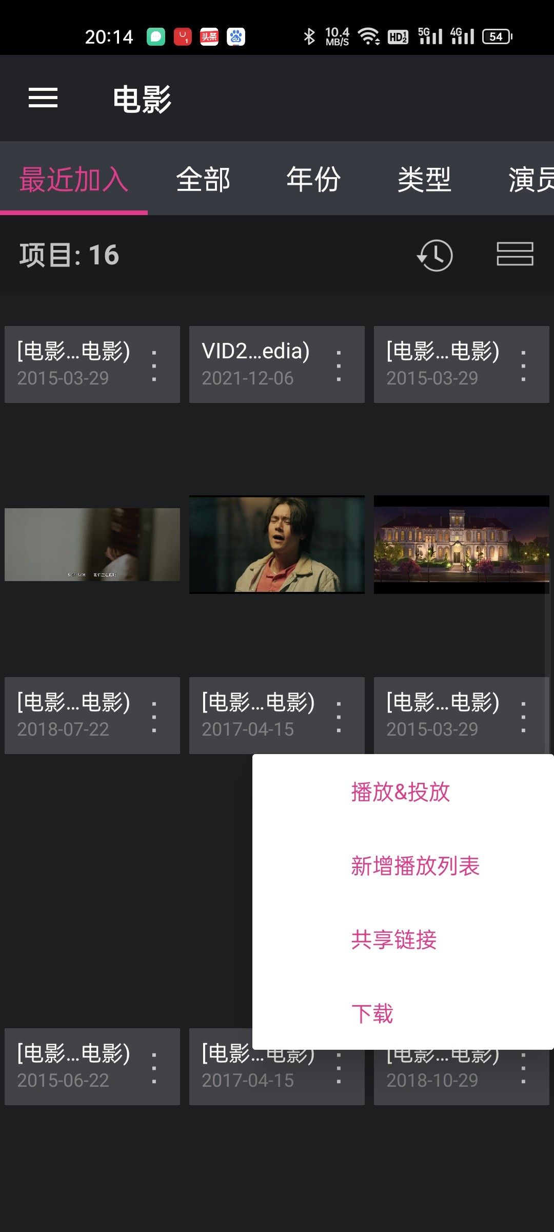 点击电影上右侧的三个小点,可以出现操作菜单,分别是播放/投放、新增播放列表、共享链接、和下载。