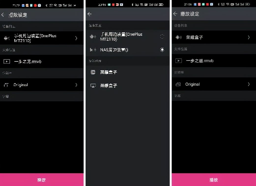 点击播放/投放可以选择使用手机播放或者投屏,此时还可以对分辨率进行选择。如果需要投屏的话可以点击设备列表下的“手机周边装置……”,然后进入新界面,选择NAS周边设备,我现在连接在局域网中的智能播放设备就是荣耀盒子,点击荣耀盒子之后会回到之前界面,但是播放设备会发生改变,此时再点击播放就可以完成投屏。