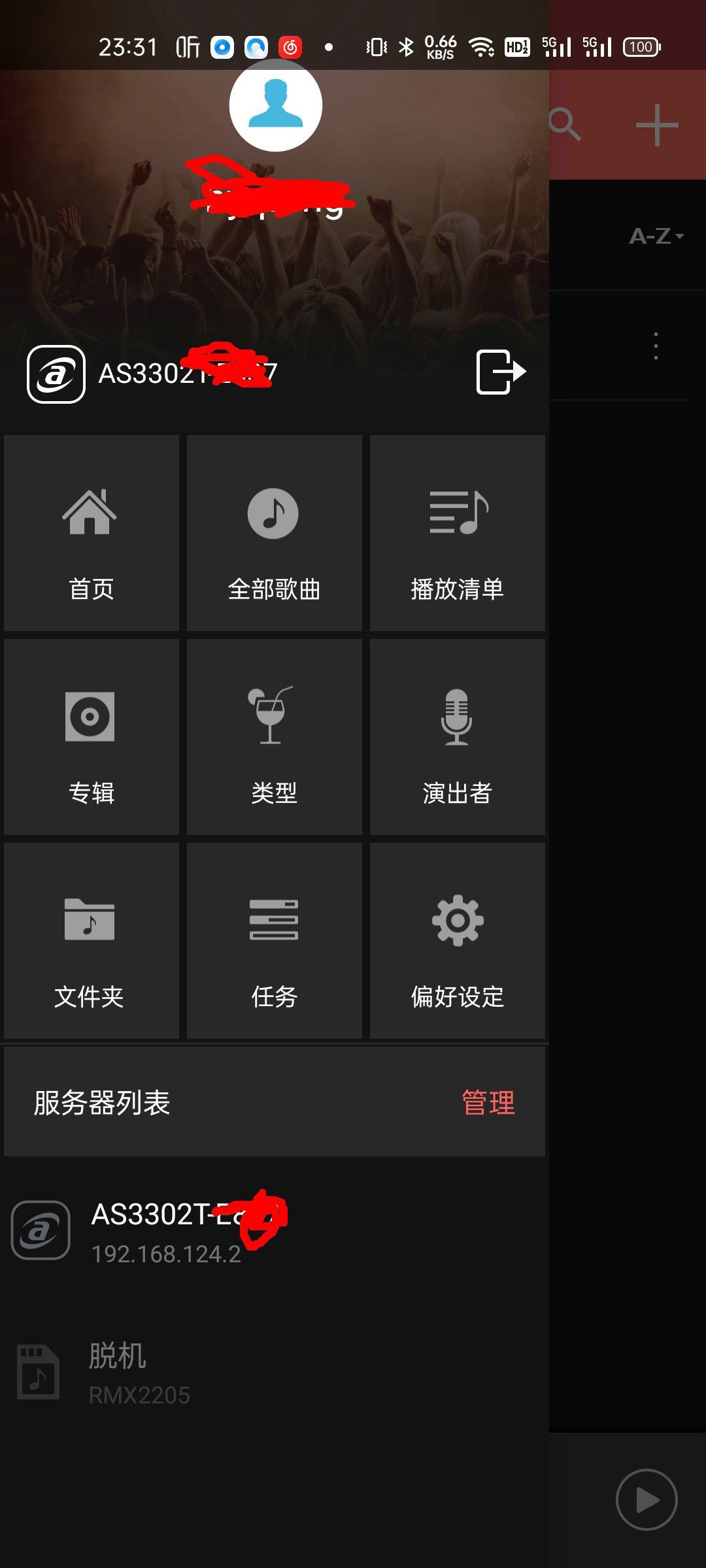 从主菜单就可以看到,AiMusic的大致分类包括专辑、类型、演出者,而且也可以自建播放清单和从NAS上直接下载指定的音乐。如果你有多台爱速特的NAS,也可以非常方便的在服务器列表处进行切换。