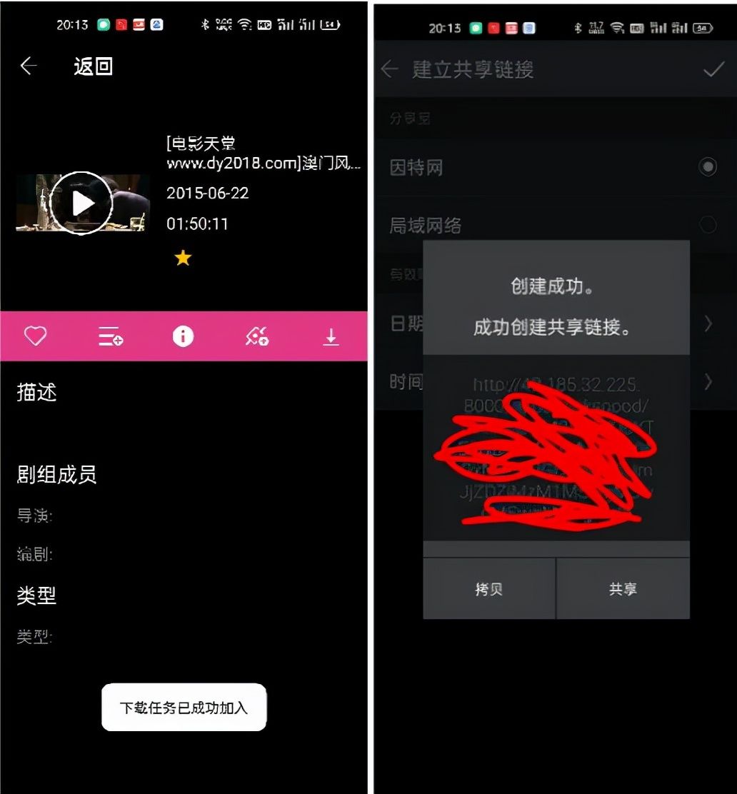 除了投屏还有下载和共享链接。不止外面的菜单,点进视频后,中间菜单右侧也有相应的下载按钮点击后会自动把电影下载到手机本地。点击因特网或者局域网,点击右上角√,会成功创建一个共享链接。这个链接的有效期可以在下面进行设置。