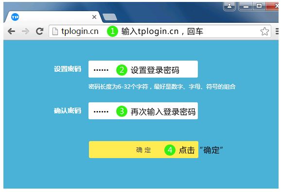 2、设备在地址栏并输入tplogin.cn(部分较早期的路由器管理地址是192.168.1.1),并在弹出的窗口中设置路由器的登录密码,(密码长度在6-15位区间),该密码用于以后管理路由器(登录界面),请妥善保管。如下图:
