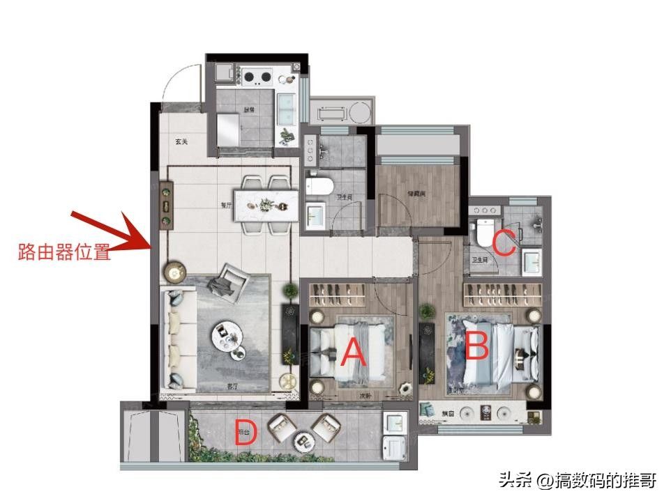说了这么多,大家对锐捷天蝎功能配置肯定了解了,实际体验到底如何呢?经过我的一番对比测试,家庭网络环境有了翻天覆地的变化,游戏延迟率也更低了。我家是三室2厅2卫户型,面积为108㎡,卧室和客厅隔了一睹厚厚的墙,所以卧室网络体验并不好。本来一天忙碌下来,最惬意的事情就是躺在床上和朋友开黑,网络不好的确很影响心情。按照图示,我将锐捷天蝎放在镜头位置,分别测试了手机在A、B、C、D点的网速,并且对比上一台路由器的信号。