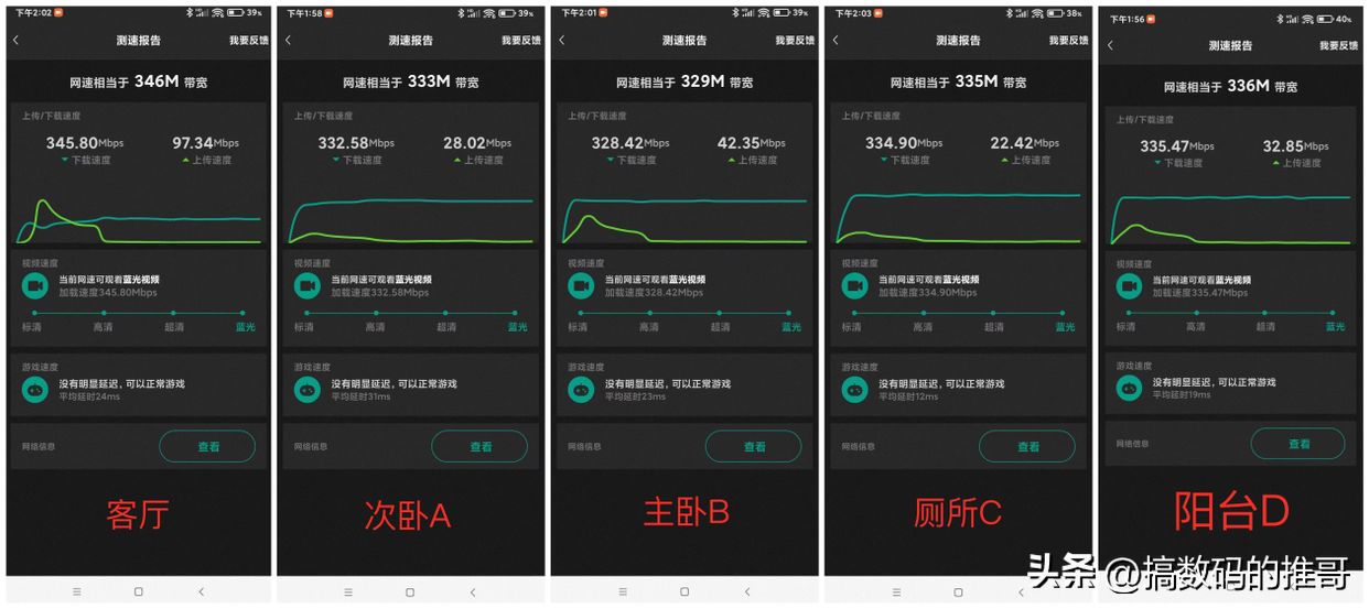 从上图可以看出,客厅位置信号最好,速率达到345.8Mbps,我家办的是300M宽带,用上这台锐捷天蝎之后,网速实际上稍稍超出300兆宽带水平。到了次卧A位置后,下载速度下降到332Mbps,主卧B是328Mbps,厕所C位置是334Mbps,阳台和客厅是相通的,速率达到334Mbps。