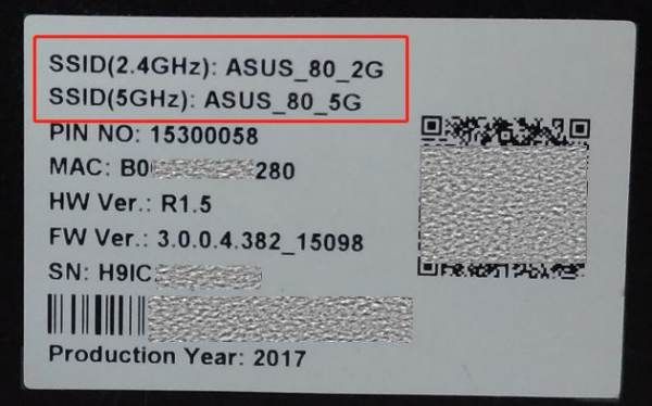 路由器默认的网络名称可以在路由器机身贴纸上看到 SSID: ASUS_XX (如下图红框处)