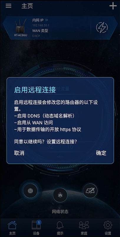 11、进入路由器设置页面后,会提示“启动远程连接”,若需要在外网通过华硕路由器APP访问路由器设置页面请点击“确定”