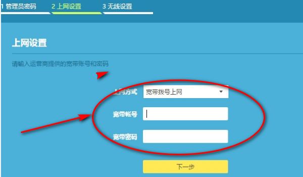 6、在上网设置页面选择宽带拨号上网方式,并输入宽带账号和宽带密码,点击下一步。