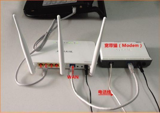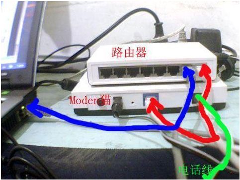 (有ADSL Modem猫)将电话线(比较细的那根线)接猫的line口(比较小的那口),猫分出来