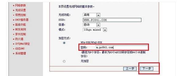 4.然后就可以设置无线网络了,填写无线网络名称,可以自己起名,也可以使用系统默认名字,这个就是WIFI账号,填完后选择加密方式,设置密码,这个是WIFI密码。填完后选择下一步。