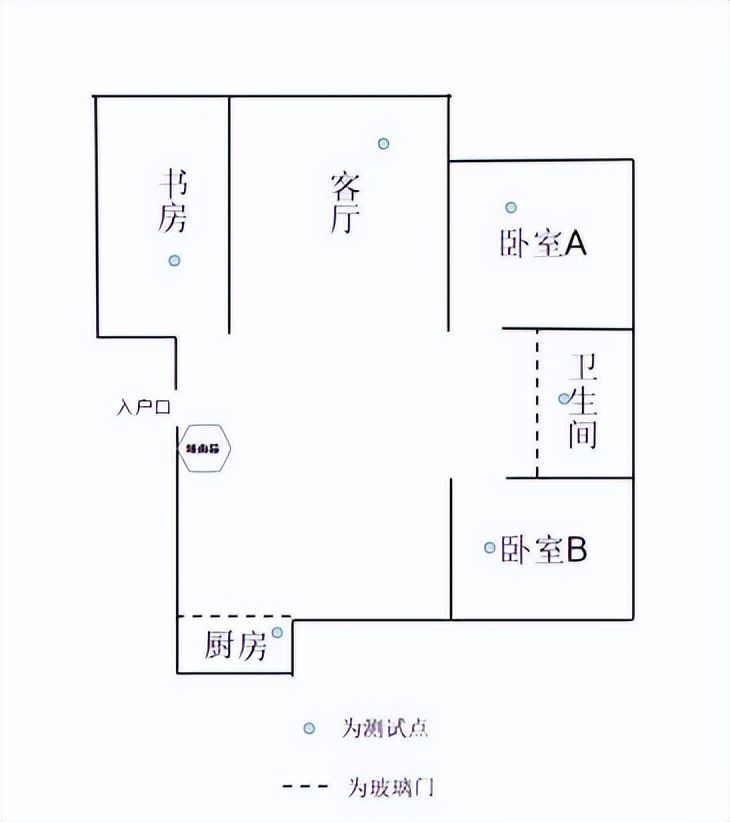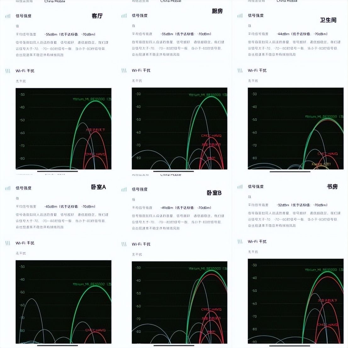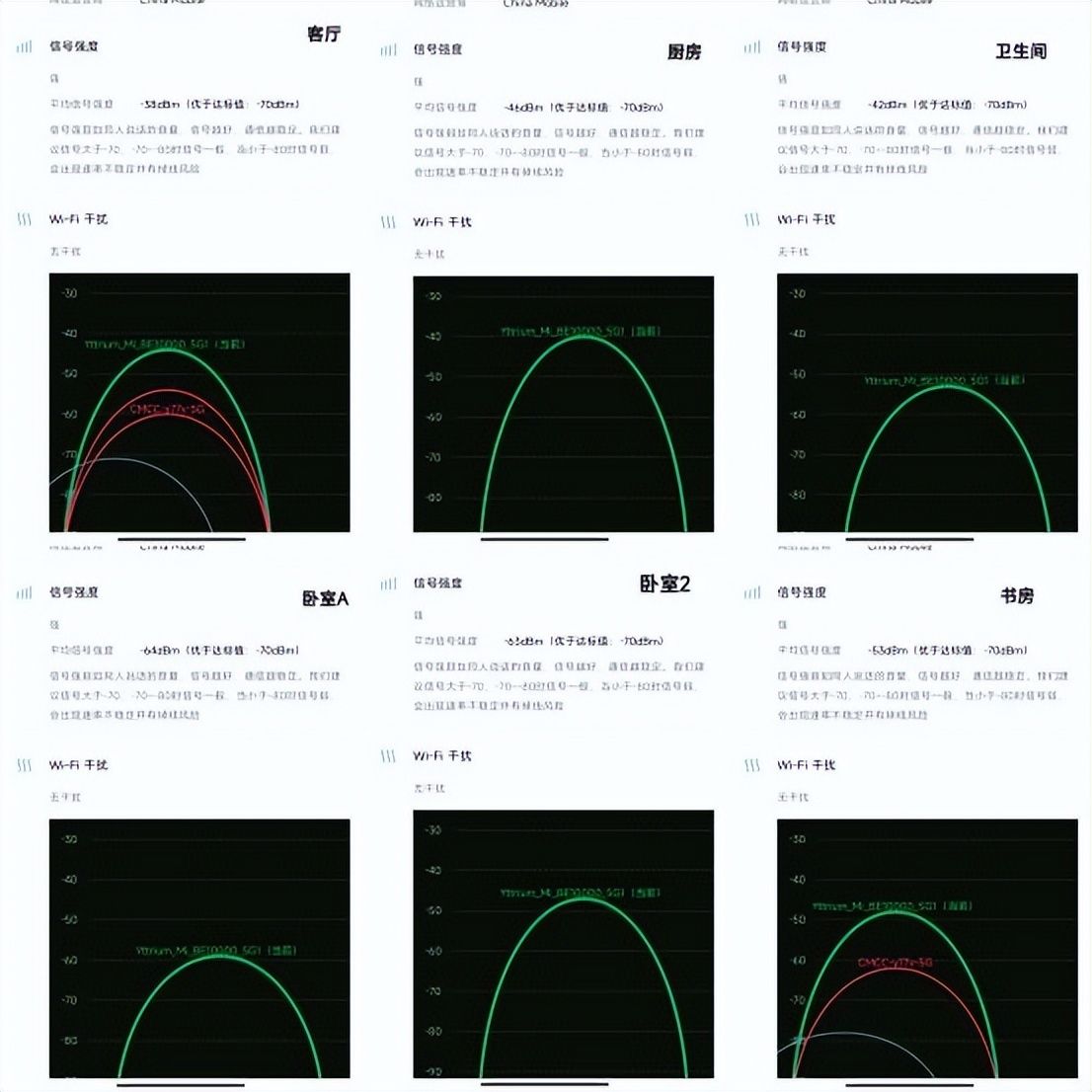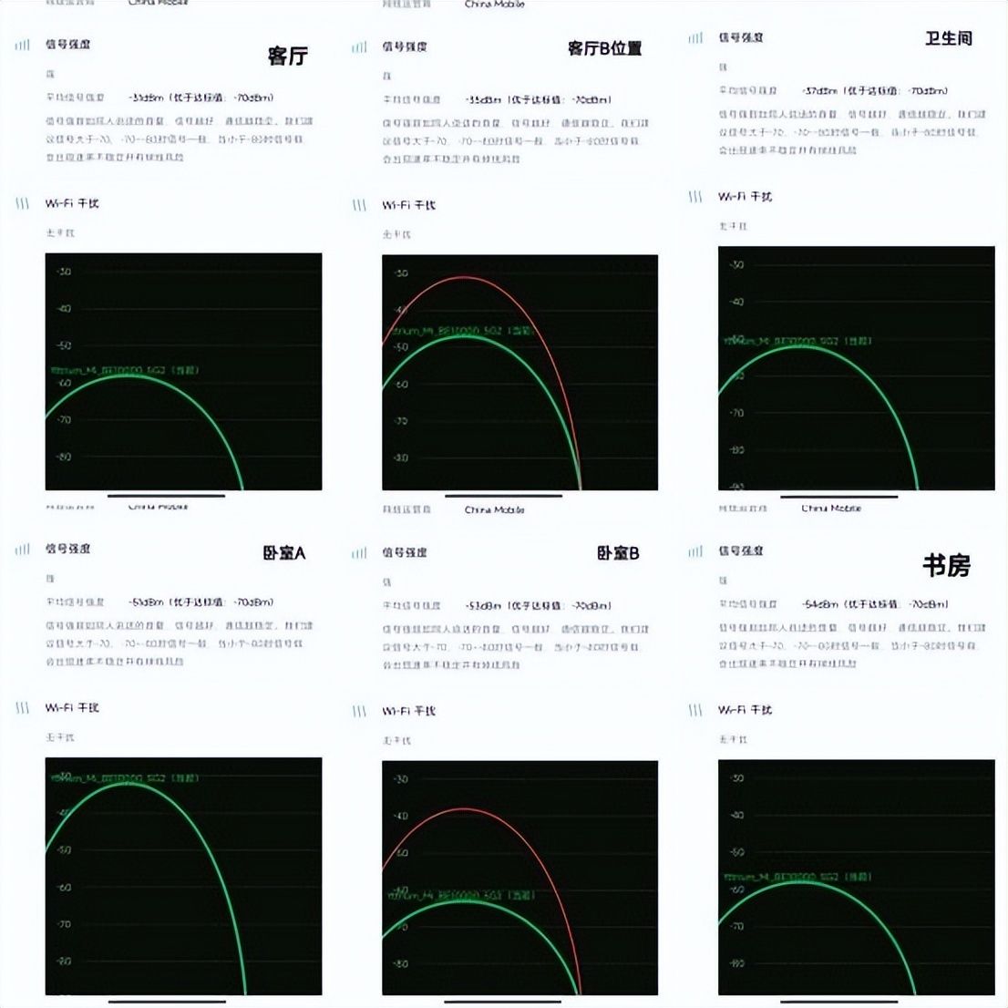 我在家里6个不同位置测试了信号强度,可以看出,2.4G频段下,在客厅和需要穿墙的卧室里信号强度非常很好,而且相差不大,符合2.4G频段信号好、穿墙能力强的特征。