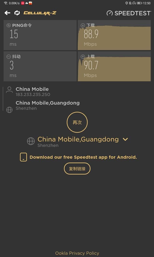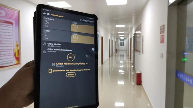 虽然局里面的宽带是一个千兆的光纤,但是分到每一个房间的宽带是一个百兆的宽带,所以我们这里能测到的最大速度也就是上传下载100兆。而我们来看一下这个地方的测试数据,它的信号强度是54db,上传下载速率基本上能差点就是满速的的90Mbps。我们在这里可以看到在这个点的信号负荷强度是没什么问题的。