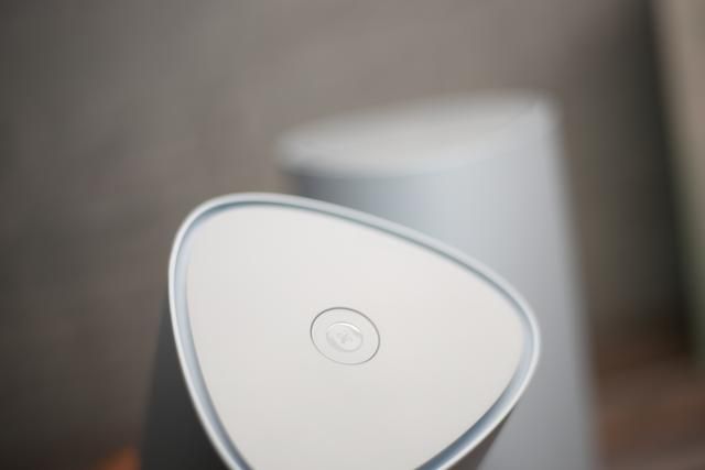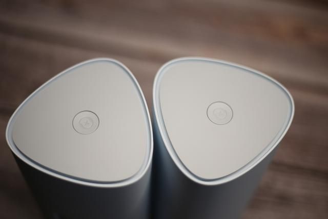 360全屋路由器V6M的造型采用了类似于三角柱的形状,正面区域底部设计有指示灯、顶部区域中间部分设计有Colink实体按键用来实现快速组网和其他控制功能需求。