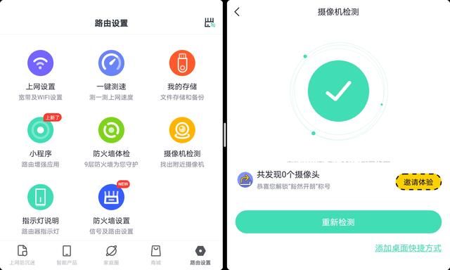 360路由的APP,有些功能是其他路由的APP没有实现的,比如以下这款就是可以检测到你路由连接的所有的摄像头其中包括我们笔记本的摄像头,如果有使用可能也会被检测到。这样就能够很好的保护你家里面的隐私跟安全,让一些摄像头泄露的危险事件而避免发生。