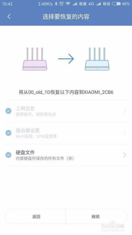 选择从其他小米路由器恢复,点继续,此时会提示连接到新路由HD的WIFI,如果没有连接成功返回重来,或者提示正在连接时手动连接HD的WIFI (以XIAOMI_开头的,末尾不带5G)