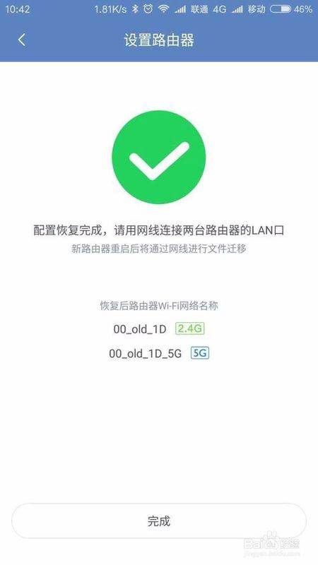 提示恢复完成,在这里可以等2分钟等待路由重启成功-并把WAN口的网线从旧路由插到新路由,让新路由连接外网,