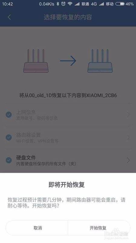 选择从路由 00_old_1D恢复,输入WIFI密码-继续-如果提示未知错误,再试几次,如果超过3次仍然提示未知错误,检查路由器版本后换个姿势重新再来。