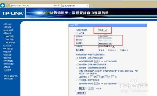 点击网络参数----WAN口设置。WAN口连接类型选择“pppoe连接”并输入用户名和密码,保存。