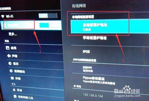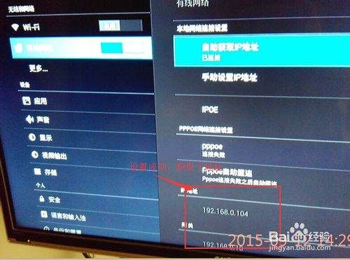 4、设置完毕后,再选择电视机的无线设置,搜索家里的网络,将密码输入,自动获取IP地址,连接成功即可。