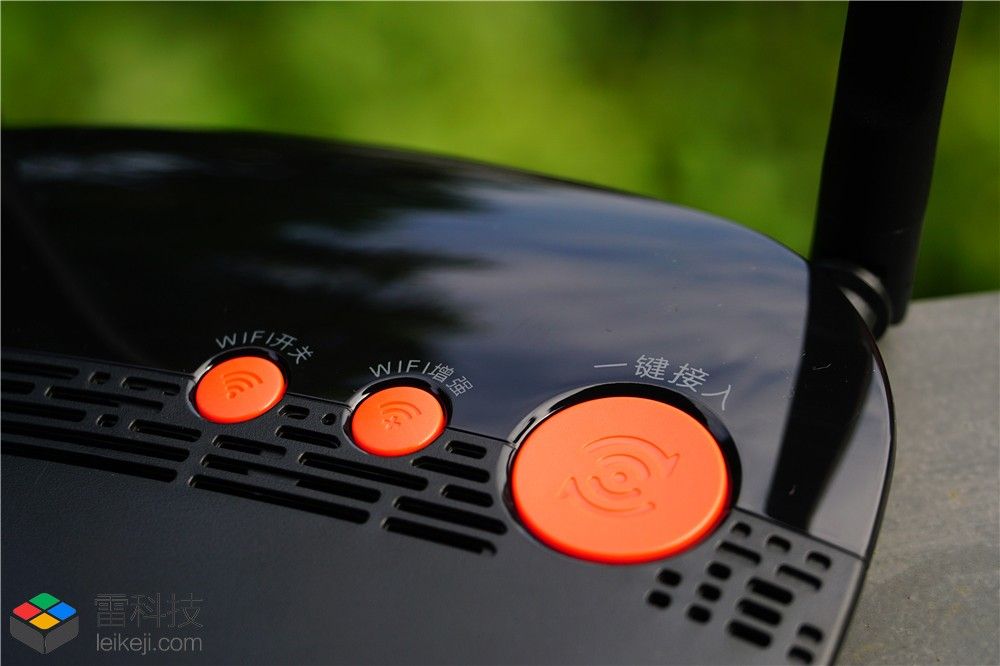 上面板三个实体按键主要就是针对环保而生,WIFI开关就是控制路由器信号的开和关,关闭后手机就搜索不了WiFi信号,所以当平时不需要WiFi信号时,可以点按此键关闭WiFi信号,降低辐射频率,而WIFI增强按键则可以切换信号的强度(标准/增强),一键接入键则用于当用户首次配置路由器时,无需进行相关的配置操作和密码输入即可让路由器连接网络。