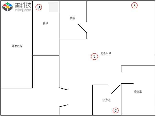 先来看一张测试环境的空间草图,其中,A点为萤石W1路由器放置点,B、C、D均为测试点,其中A点距离B点7米左右,其余均按大概比例测绘,其它点的距离可参考AB点距离估值。