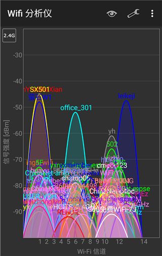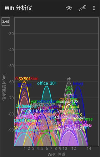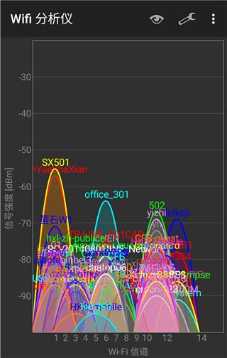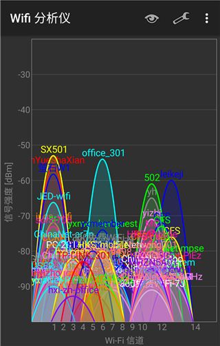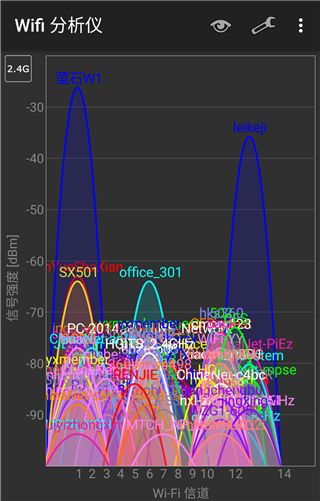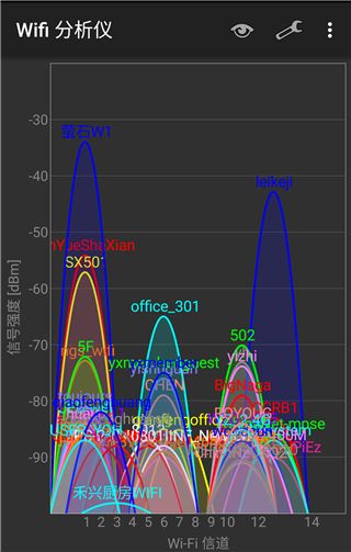 测试区域为正常的办公环境,由于是公共区域,所以下面信号强度截图中会出现多个路由器信号强度曲线,同时因为信号的相互干扰,测试存在一定的误差,但这也刚好能体现出日常使用下路由器的状态表现。