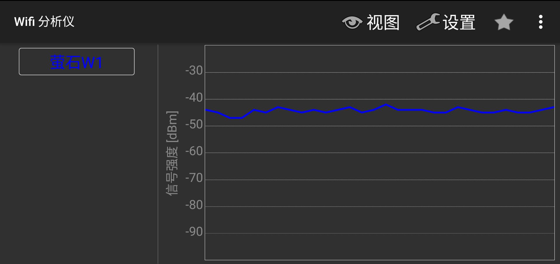 下图中,左图为萤石W1在标准模式下的信号强度截图,右图为增强模式下的信号强度截图。蓝色,名称为“萤石W1”的曲线即代表萤石W1路由器的信号强度,其中纵轴曲线的数值越往上代表强度越好,反之则差,一般60至80dbm信号属于正常状态,最好的能到40dbm,80到90dBm或以下则比较差了(数值均表示为负值)。