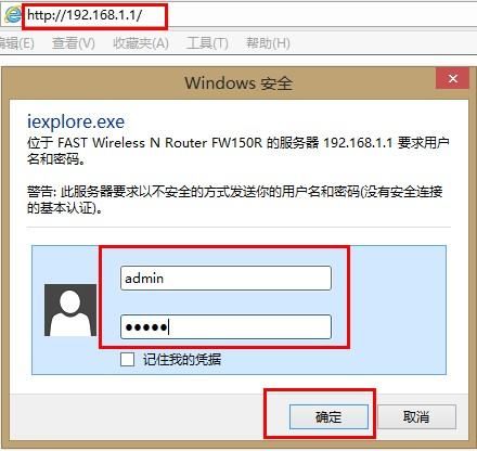 1、登陆到web管理界面:在浏览器中公输入192.168.1.1并按回车键---->输入用户名和密码(默认是admin)---->点击“确定”;