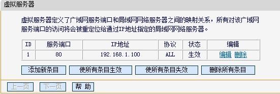 5、设置端口映射:在“服务端口号”填写需要映射的端口号,这里填写80---->在“IP地址”后面填写80端口服务器所在的内网ip地址,这里是192.168.1.100---->“协议”选择ALL---->“状态”选择生效---->最后点击“保存”,就完成了端口映射的设置,其它端口的映射设置方法完全一样;