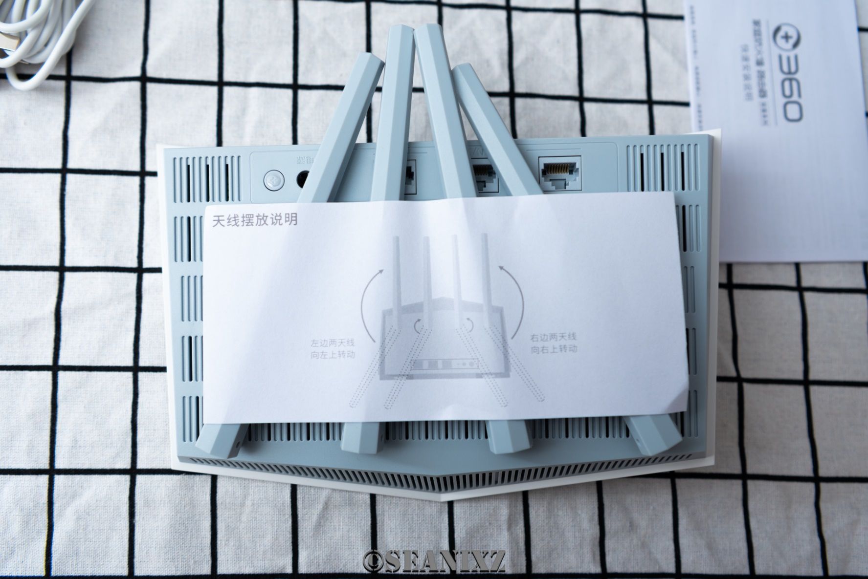 路由器背面最显眼的是这四根型号增强天线,带有天线摆放说明贴纸,天线是有限位的,仅能从一个方向转动,展开时需要注意。
