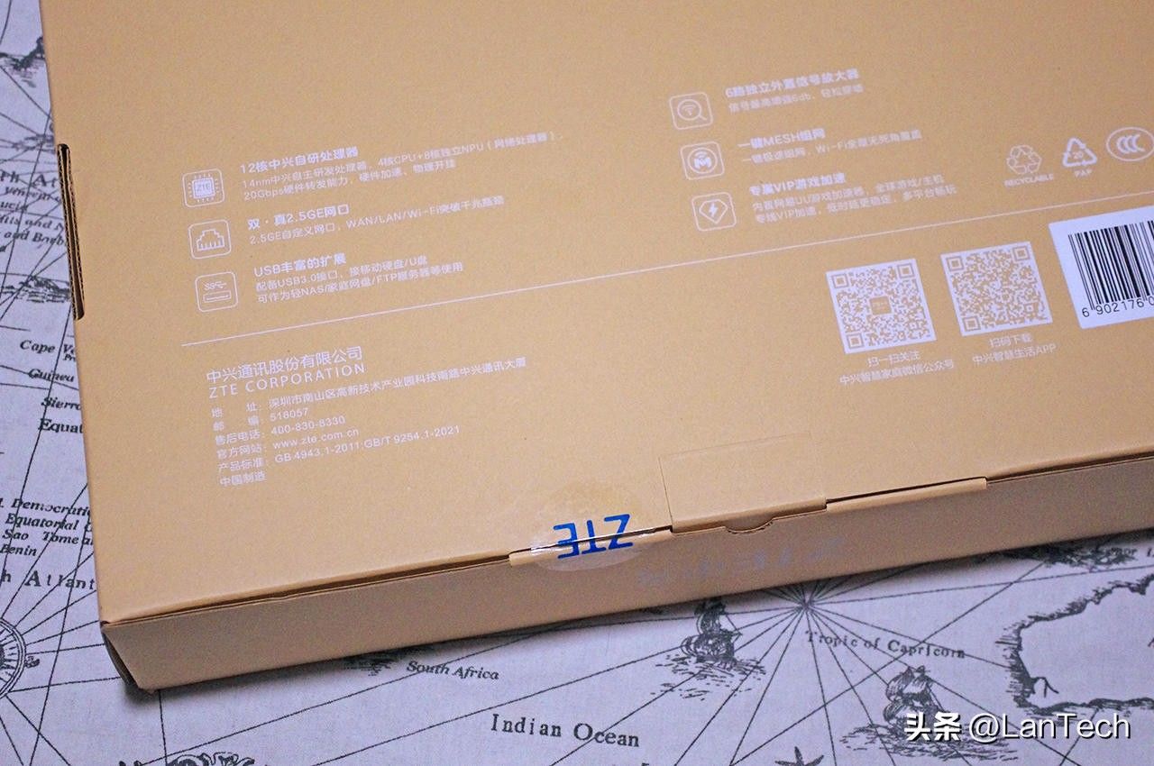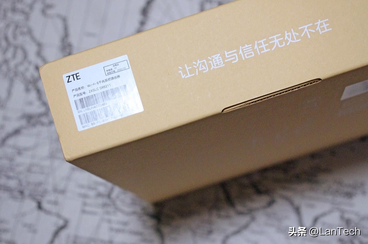 首先来看开箱,中兴AX5400 Pro+无线路由器与其他零售版本的路由器一样,都采用了环保纸盒的包装。与之对应的,市场上其他品牌则普遍采用彩盒包装。在倡导绿色循环经济的时代,中兴的环保理念和在产品上的绿色尝试可谓是走在了行业前列。