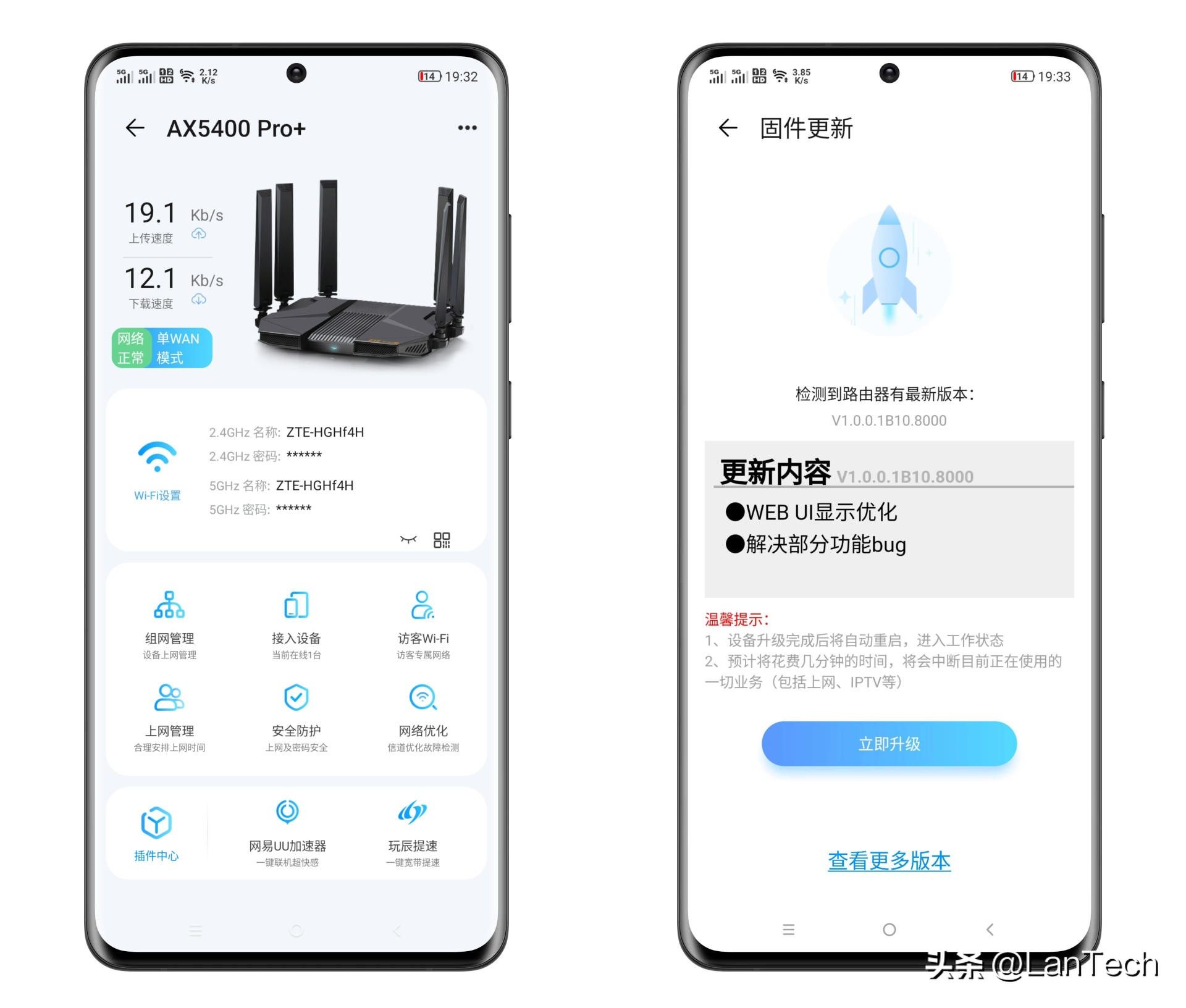 中兴AX5400 Pro+无线路由器的App管理界面的设计也较为清晰美观,开机后即提示固件更新: