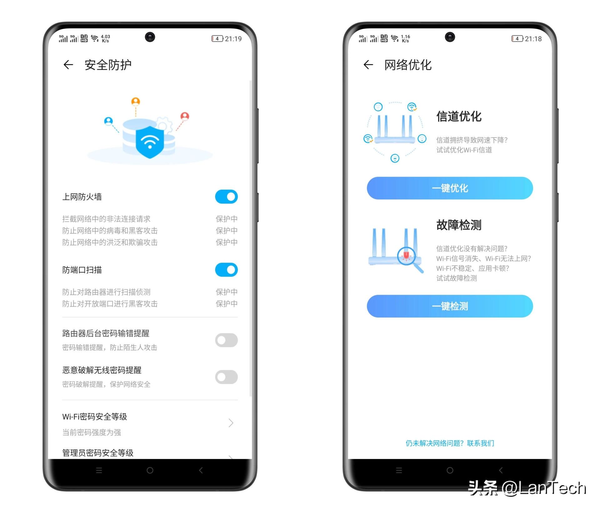 中兴AX5400 Pro+无线路由器支持安全防护功能,并且可以一键进行信道优化和故障检测: