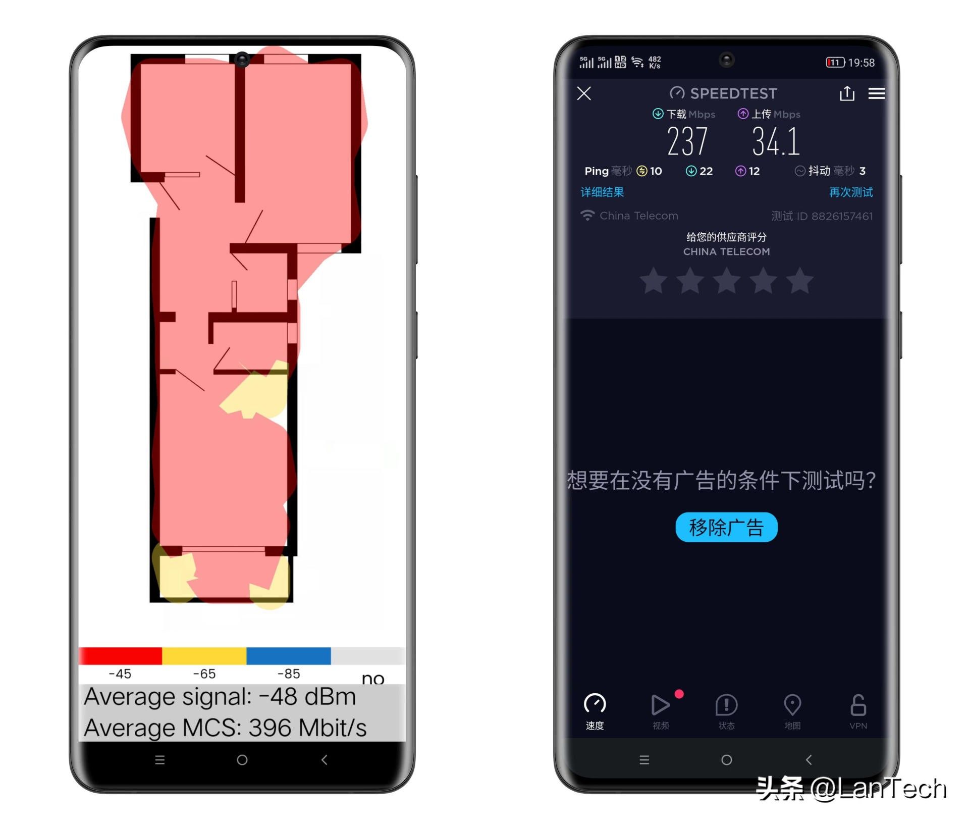 这里将路由器放在大门口位置,实际测试了中兴AX5400 Pro+无线路由器的信号表现。可以看到平均信号强度达到了-48dBm,非常出色: