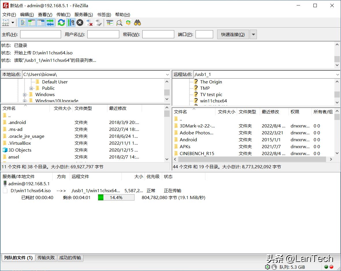 中兴AX5400 Pro+无线路由器支持Samba和FTP两种协议,这里测试了一下FTP协议。可以看到写入速度达到了19MB/s左右。一方面,这可能是电脑端无线网卡的瓶颈;另一方面,这款路由器由于刚推出,固件、特别是USB相关的性能还在不断优化中。中兴AX5400 Pro+无线路由器本身对于USB 3.0的速度支持看来是很给力的:
