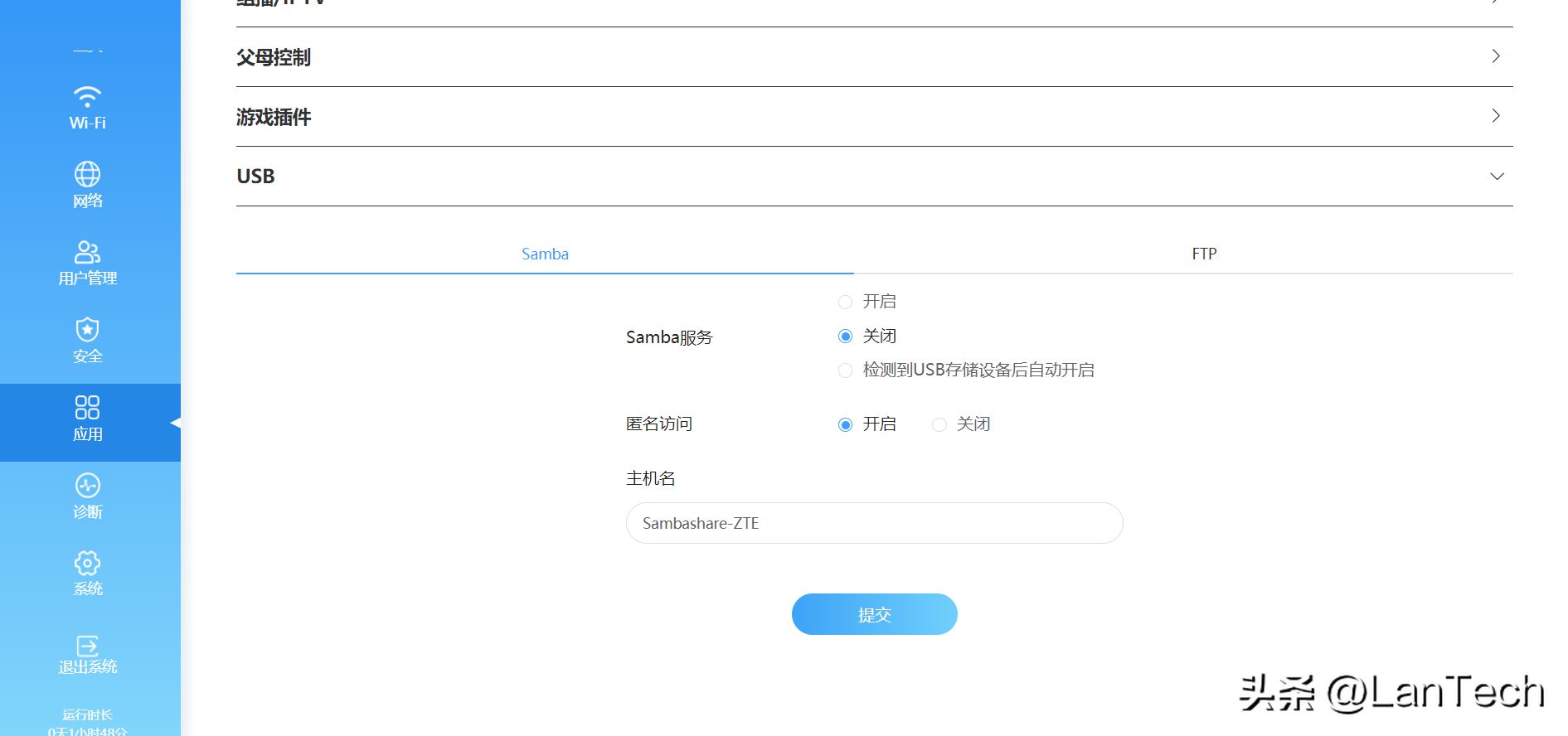 通过网页端进入管理界面,就可以打开中兴AX5400 Pro+无线路由器的USB功能: