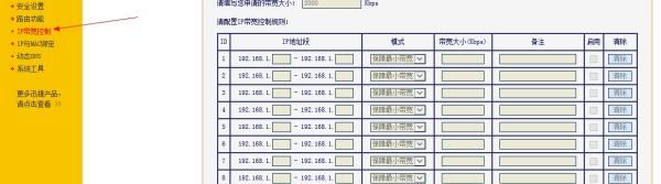进去以后找到左边菜单有一个叫IP带宽限制之类的东西.如图是我的路由器的设置界面.