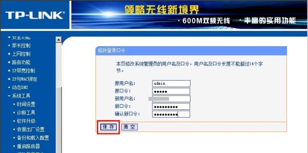 5、在修改登陆口令页面,先输入原来的用户名密码,再输入你要设置的用户名和密码,提示一下,用户名都可以更改的哦,不一定要用原来的admin,设置完成,点击保存,如图。