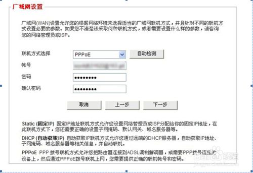 3.在路由设置里面的WAN设置或互联网设置页面中(也可按引导进行设置),把你家宽带上网帐号和密码分别填写上,设置连接方式为“PPPOE”。有网关和主次DNS填写项的,最好也手动填写上。