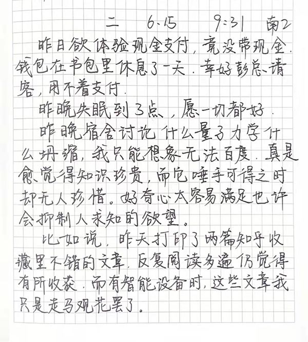 一周体验结束,他拾起智能设备借助互联网学习、补充笔记。于他而言,技术改善生活、提供便利的部分不需要被强制舍弃,他在日记本上写下,“无论网络还是生活,要找到自己的节奏。”这是他实验后更大的收获。
