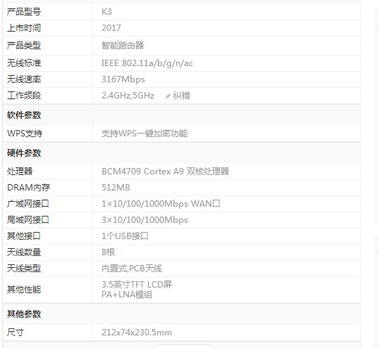 以下是k3路由器的参数: