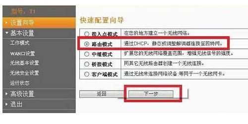2、在设置向导中的快速配置向导选择路由器模式,点击下一步。