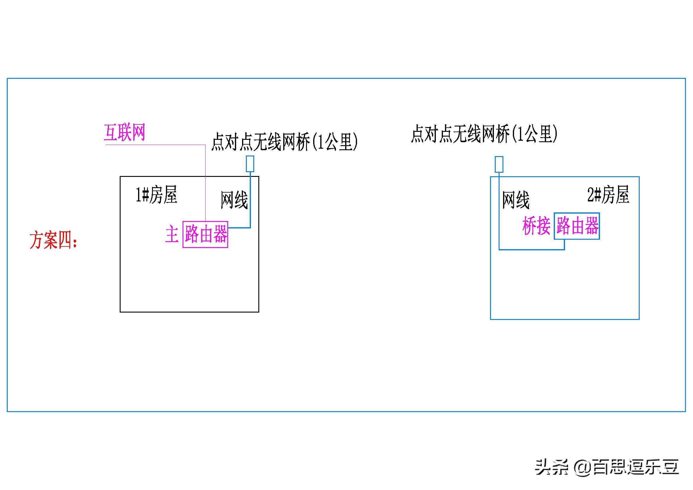 方案四:利用点对点无线网桥。此方案针对平原,中间无障碍,不具备布放各种缆线的环境特别有效。传输距离根据设备选择而变化比较大,远距离无障碍的甚至可传输10公里以上。